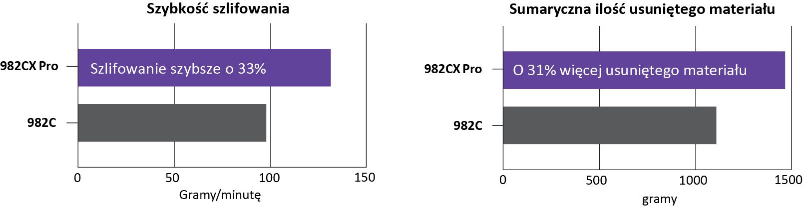 * Wyniki w oparciu o zautomatyzowany, 11-minutowy test na stali 1018 przeprowadzony z użyciem dysków fibrowych 3M™ Cubitron™ II 982CX Pro, 7 cali, gradacja 36+ i sztywnej podkładki żebrowanej 3M™ 80514 na serwomotorze.