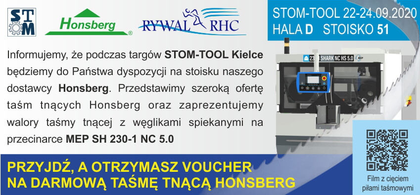 Informujemy, że podczas targów STOM-TOOL w Kielcach będziemy do Państwa dyspozycji na stoisku naszego dostawcy Honsberg. Przedstawimy szeroką ofertę taśm tnących Honsberg oraz zaprezentujemy walory taśm tnących z węglikami spiekanymi na przecinarce MEP SH 230-1 MC 5.0.