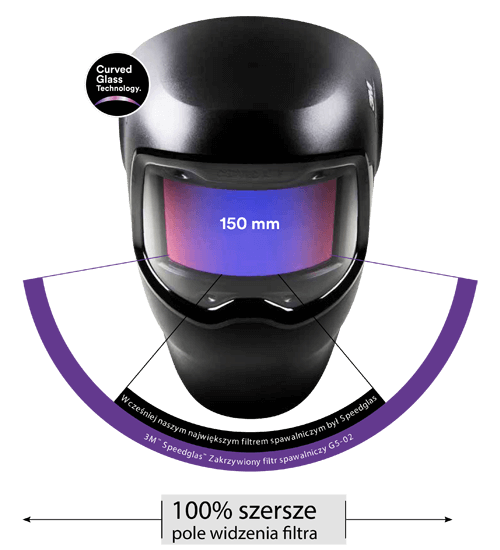 A jedyną możliwością na zapewnienie szerszego kąta widzenia, bez poszerzania profilu przyłbicy spawalniczej, było zastosowanie zakrzywionego filtra.