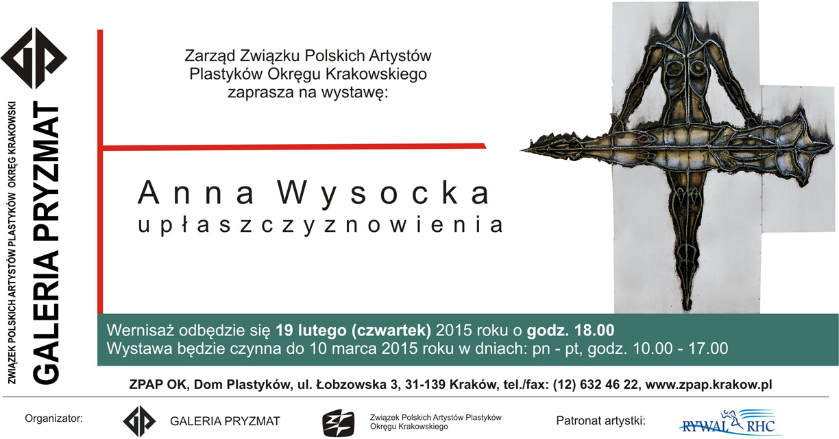 RYWAL-RHC wraz z Zarządem Związku Artystów Plastyków Okręgu Krakowskiego zaprasza na wystawę: Anna Wysocka - Upłaszczyznowienia. Wernisaż odbędzie się 19 lutego (czwartek) 2015 r. o godz. 18.00 w ZPAP OK, Dom Plastyków,ul. Łobzowska 3, 31-139 Kraków.