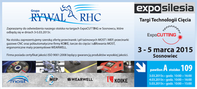 Informujemy, że w dniach 02-05.03.2015r. firma RYWAL-RCH będzie brała udział w targach ExpoCutting w Sosnowcu. Serdecznie zapraszamy do odwiedzenia naszego stoiska nr 109 wpawilonie A, na którym zaprezentujemy Państwu przecinarki i piły taśmowe MEP i MOST, przecinarki gazowe KOIKE I MOST, ściernice marki MOST i maty przemysłowe WEARWELL.