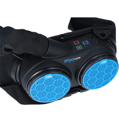 • Alarm audiowizualny, dźwiękowy i wibracyjny wskazujący niski przepływ powietrza i niski poziom naładowania baterii.