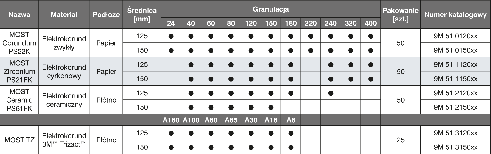 • MOST TZ - krążki ze specjalistycznego płótno ściernego 3M™ Trizact™ o precyzyjnie ukształtowanym ziarnie ściernym w kształcie piramidek. Zapewniają jednakową jakość wykończenia i wysoką wydajność szlifowania.