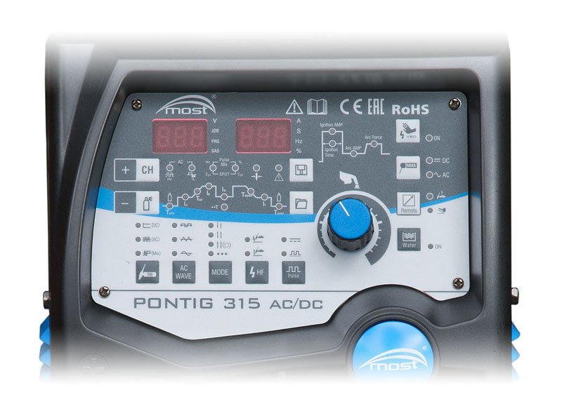 PONTIG 315 AC/DC MOST jest nowoczesnym inwertorowym prostownikiem spawalniczym do spawania metodą TIG DC stali lub stali nierdzewnej, TIG AC aluminium i jego stopów  lub elektrodą otuloną MMA. Jest  to wydajne urządzenie przemysłowe zasilane prądem 3x400 V.