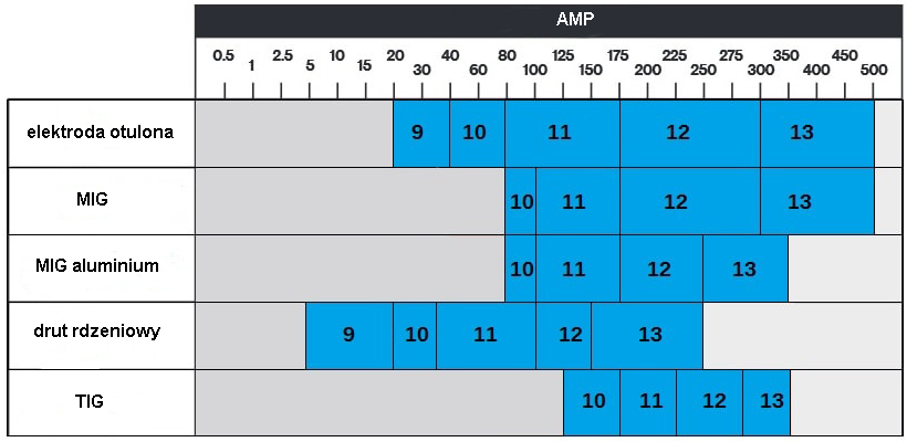 1) Stałe lub zmienne zaciemnienie – przyłbica o stałym stopniu zaciemnienia ma ustalony zakres zaciemnienia, najczęściej #10. Jeśli rozważasz opcję zmiennego zaciemnienia warto zapoznać się z załączonym schematem. Biorąc pod uwagę materiał spawany, jego grubość, metodę spawania, natężenie prądu w prosty sposób wybierzesz przyłbicę z odpowiednim filtrem spawalniczym.